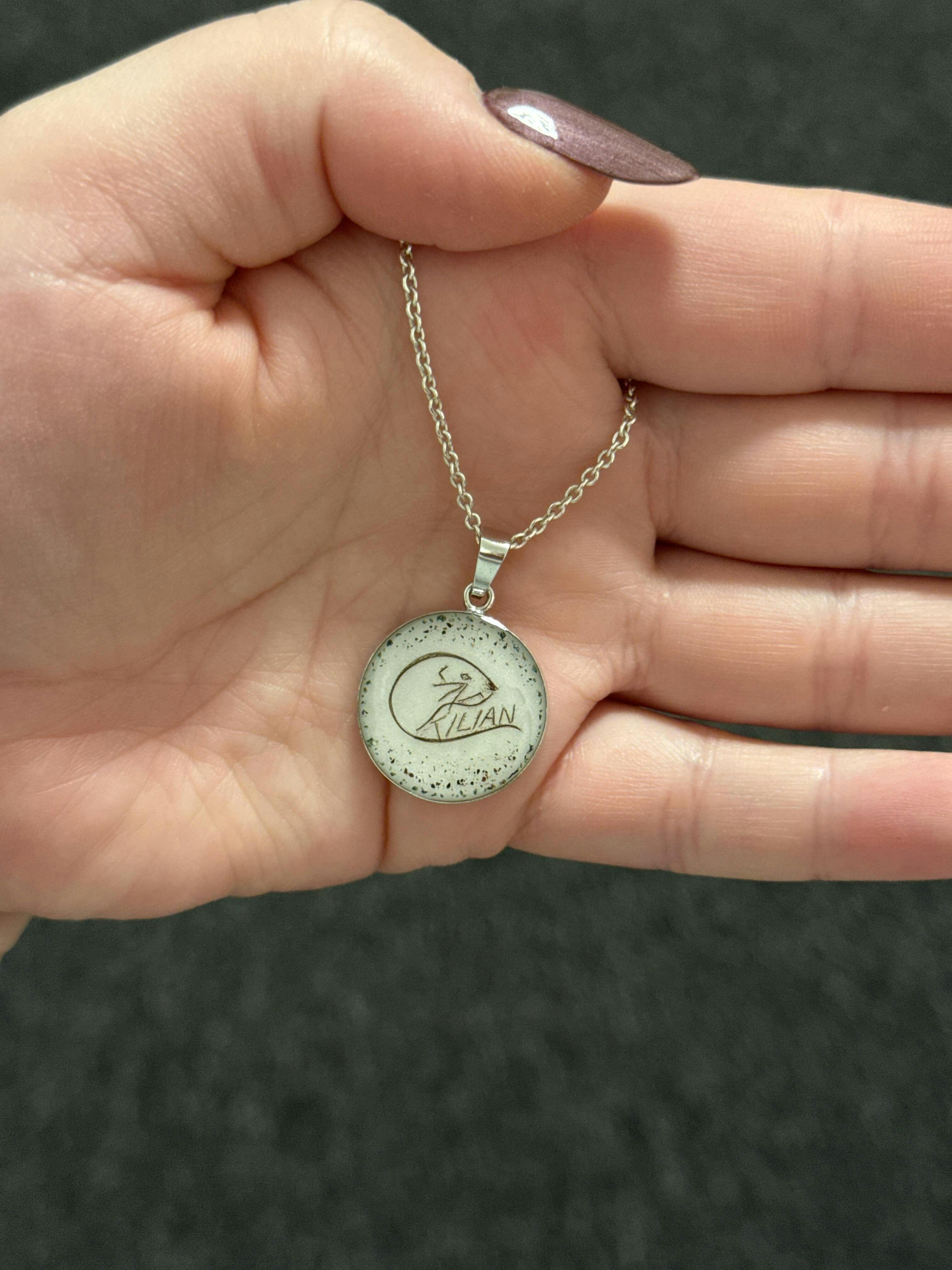 Eine individuelle Halskette aus 925 Silber – optional befüllt mit Haarsträhnen, Fell, Blumen, Muttermilch u. v. m. Für Fassungen ohne Muttermilch empfehlen wir einen weißen oder weiß-metallic Hintergrund. Hypoallergen, nickelfrei & ein liebevoll handgefertigtes Unikat ♥