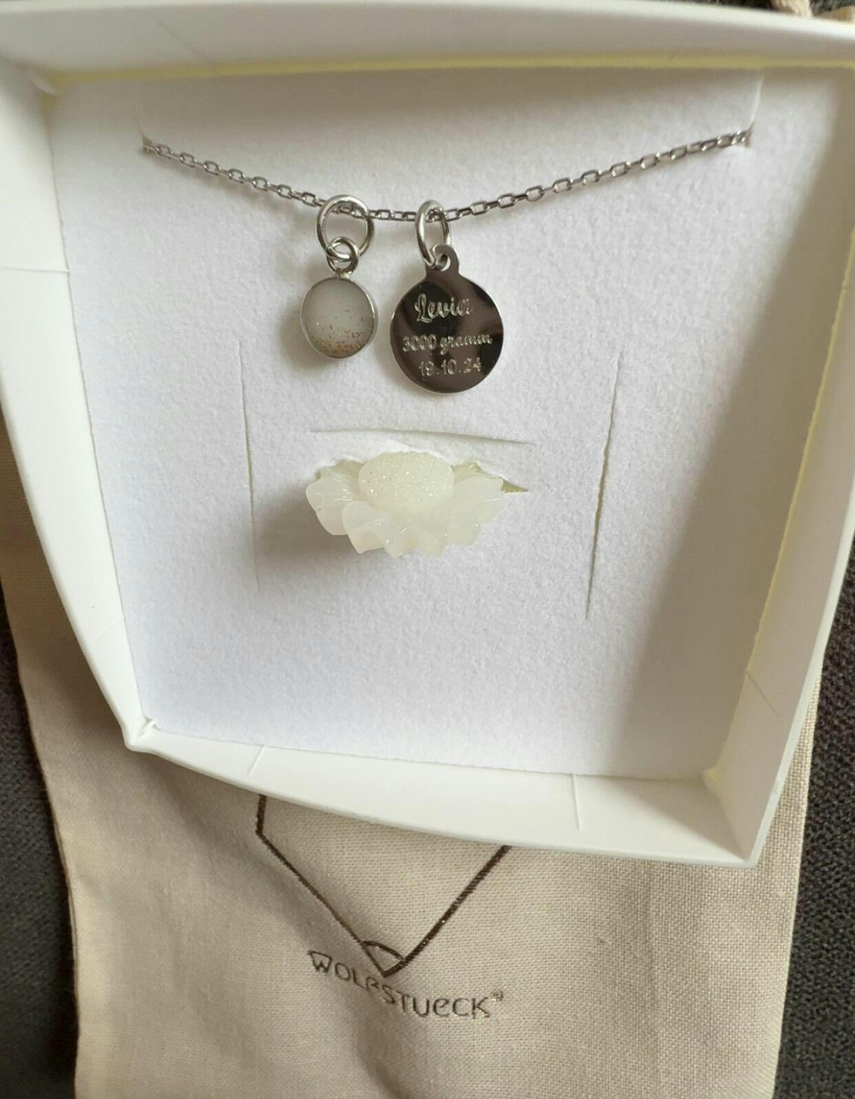 Schmuck mit Muttermilch braucht aufgrund der Konservierung der Milch etwas länger. Hier beträgt die Lieferzeit je nach Design ca. 9-13 Wochen nach Erhalt der Materialien.