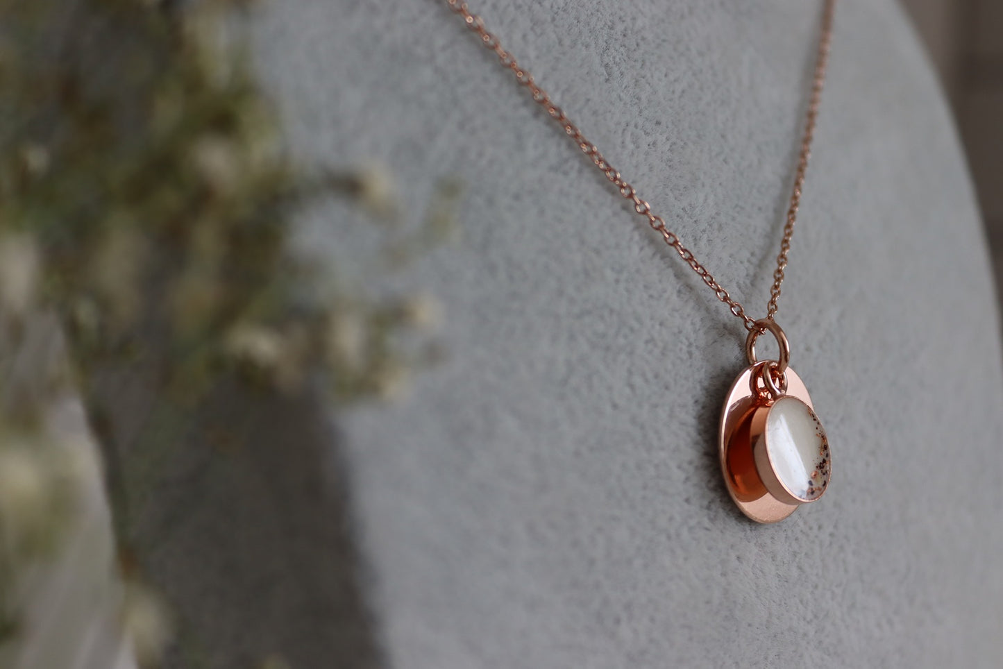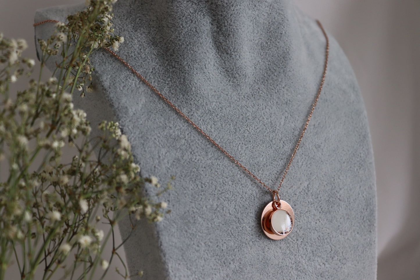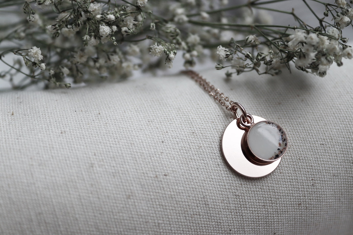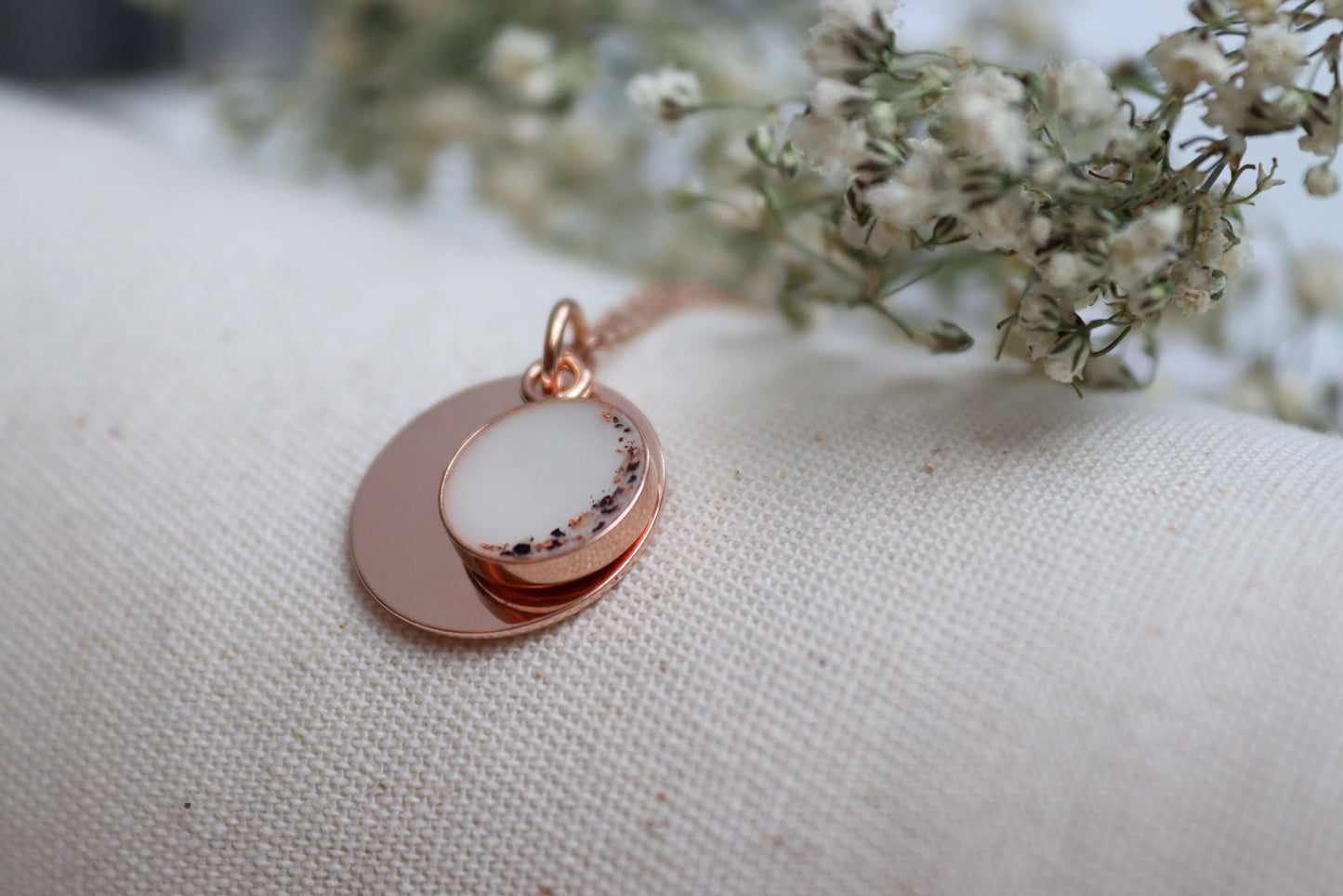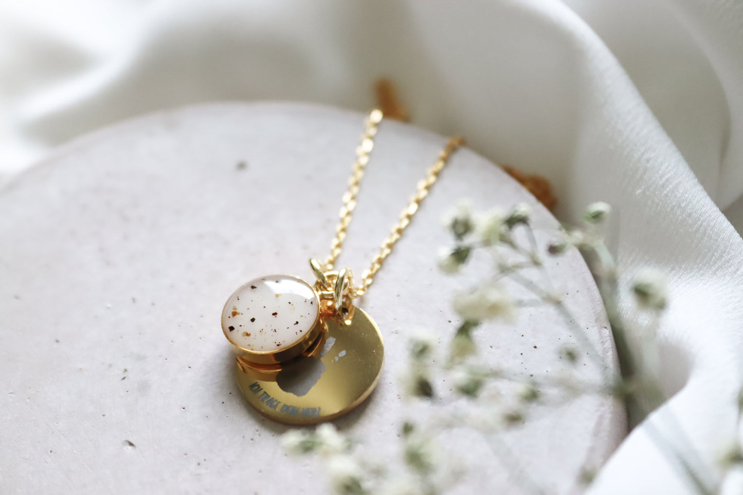 Eine 45 cm Halskette aus 925 Silber mit einem 16 mm Gravurplättchen (inklusive Standardgravur auf der Vorderseite) und einer 10 mm Fassung, optional befüllt mit Muttermilch. Ebenso können Blüten, Nabelschnur, Asche, Fell u. v. m. eingearbeitet werden. Hypoallergen, nickelfrei & ein liebevoll gefertigtes Unikat ♥