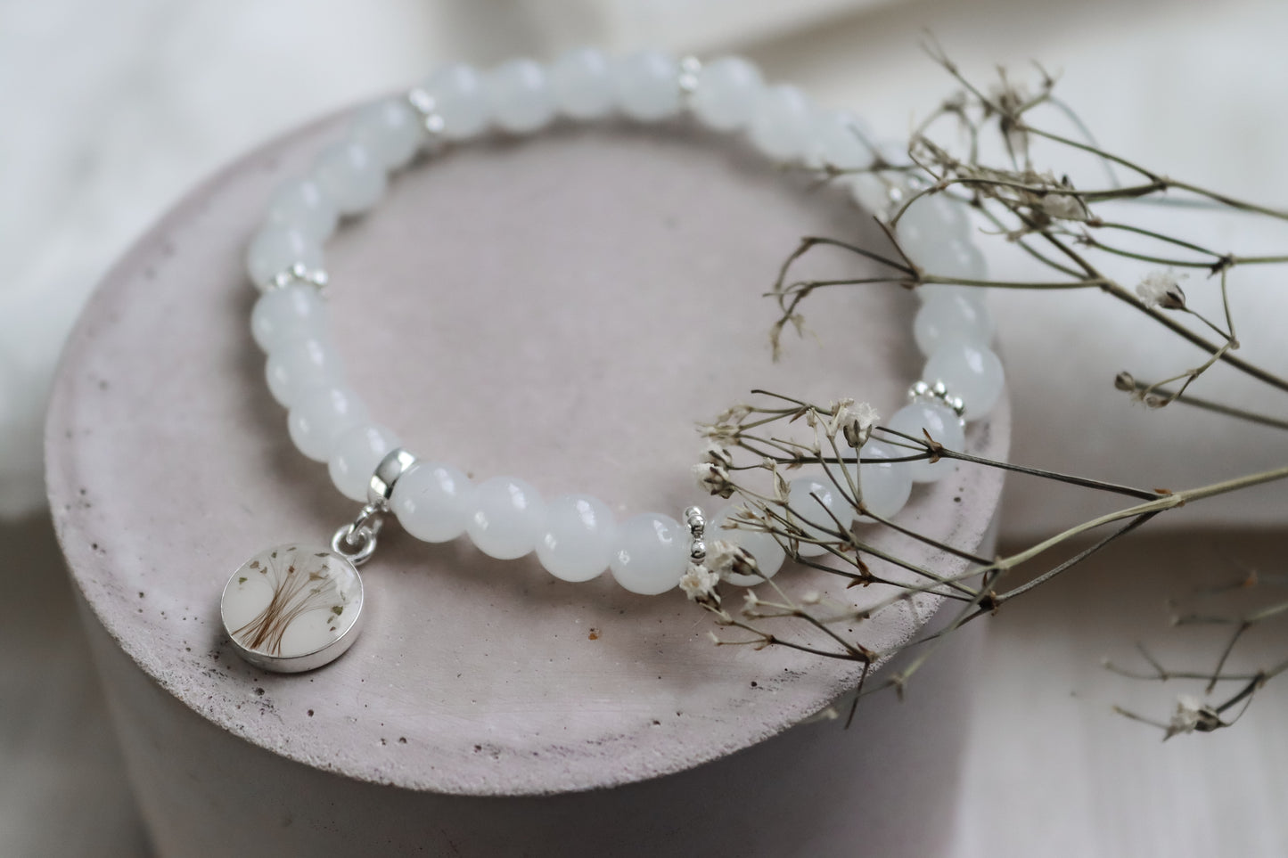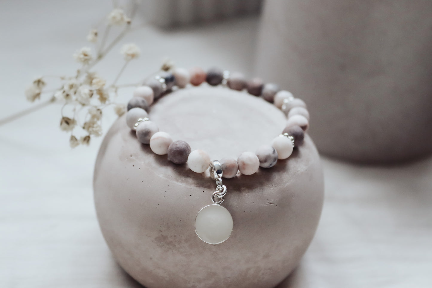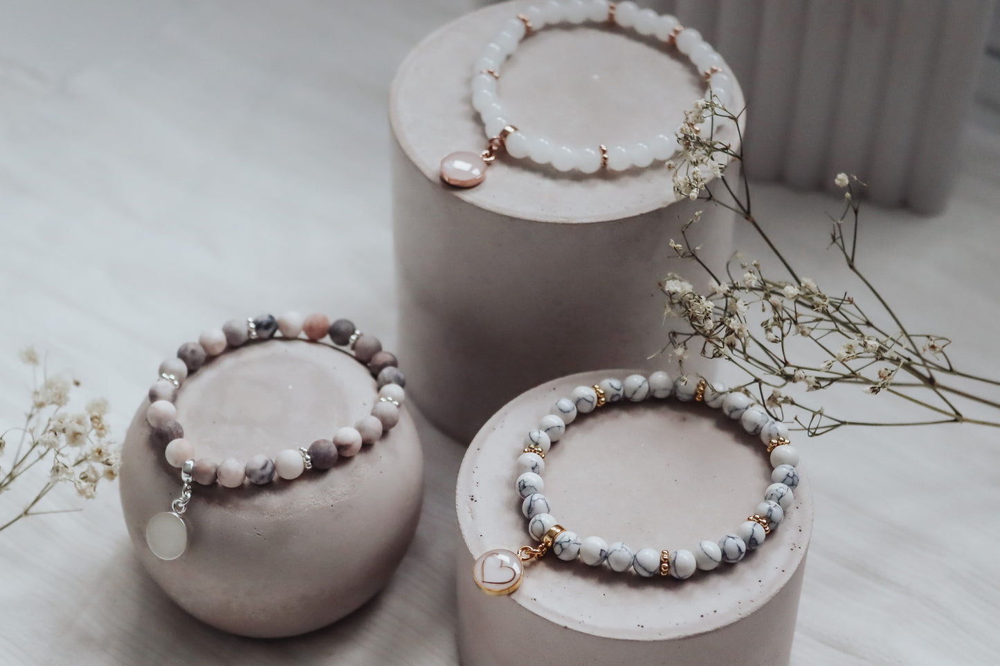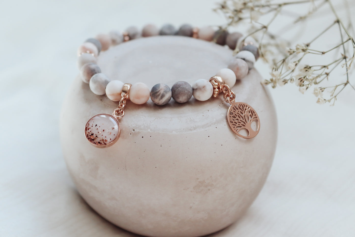 Ein individuelles, hochwertiges Perlenarmband aus echten 6 mm Naturstein-Perlen mit einer 10 mm Fassung für dein Wunsch-Material. Das Armband ist leicht elastisch und wird mit Zwischenelementen aus 925 Silber gefertigt. Bitte beachte, dass Natursteine individuelle Maserungen haben und sich im Aussehen leicht unterscheiden können. Optional kann unter „Extras“ eine zweite Fassung dazu bestellt werden.